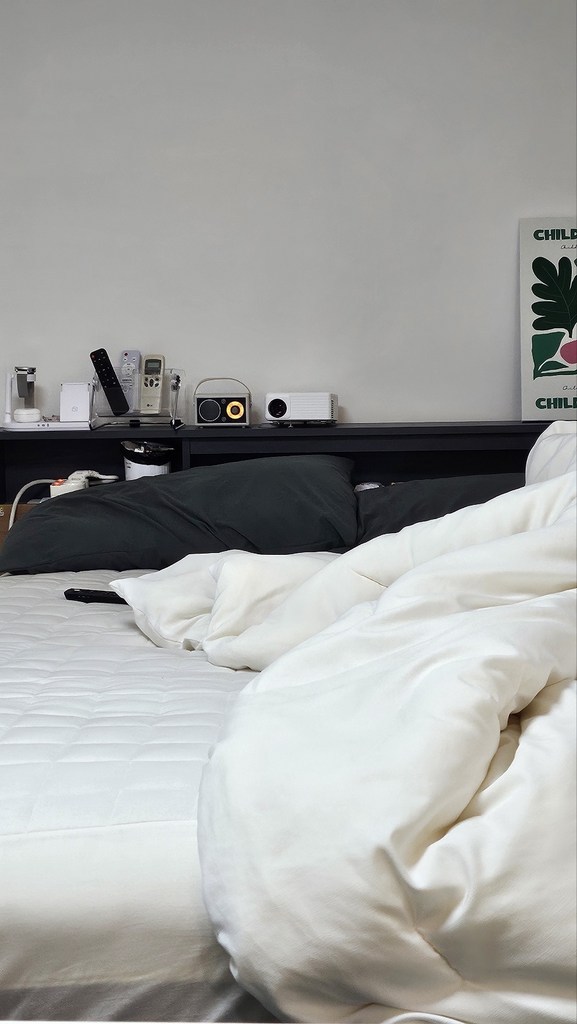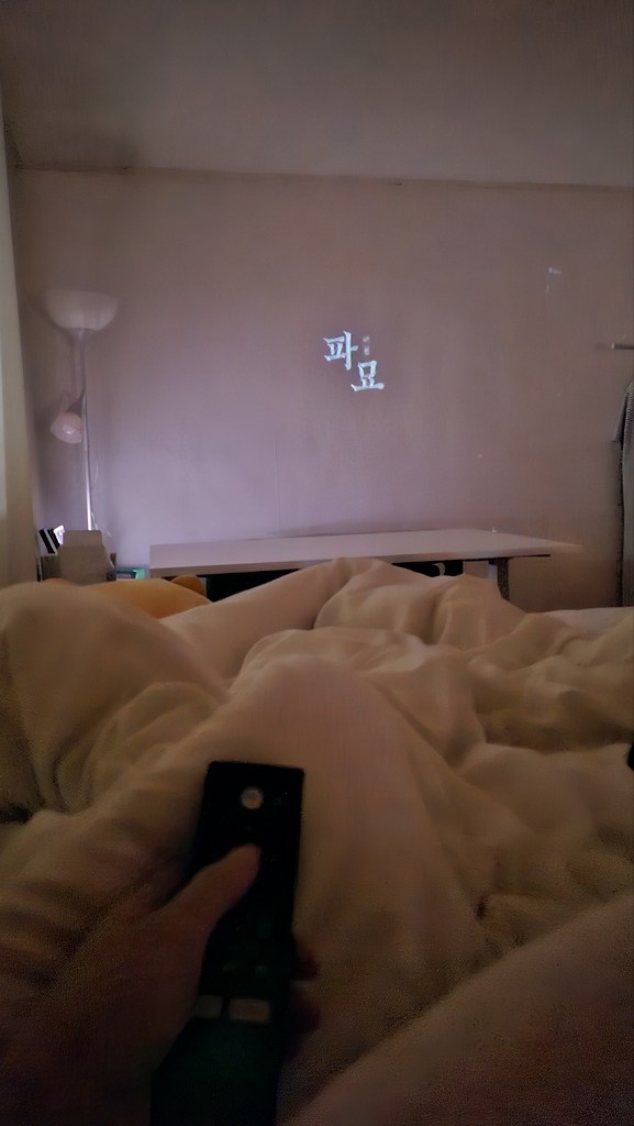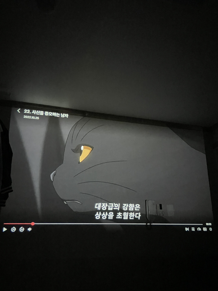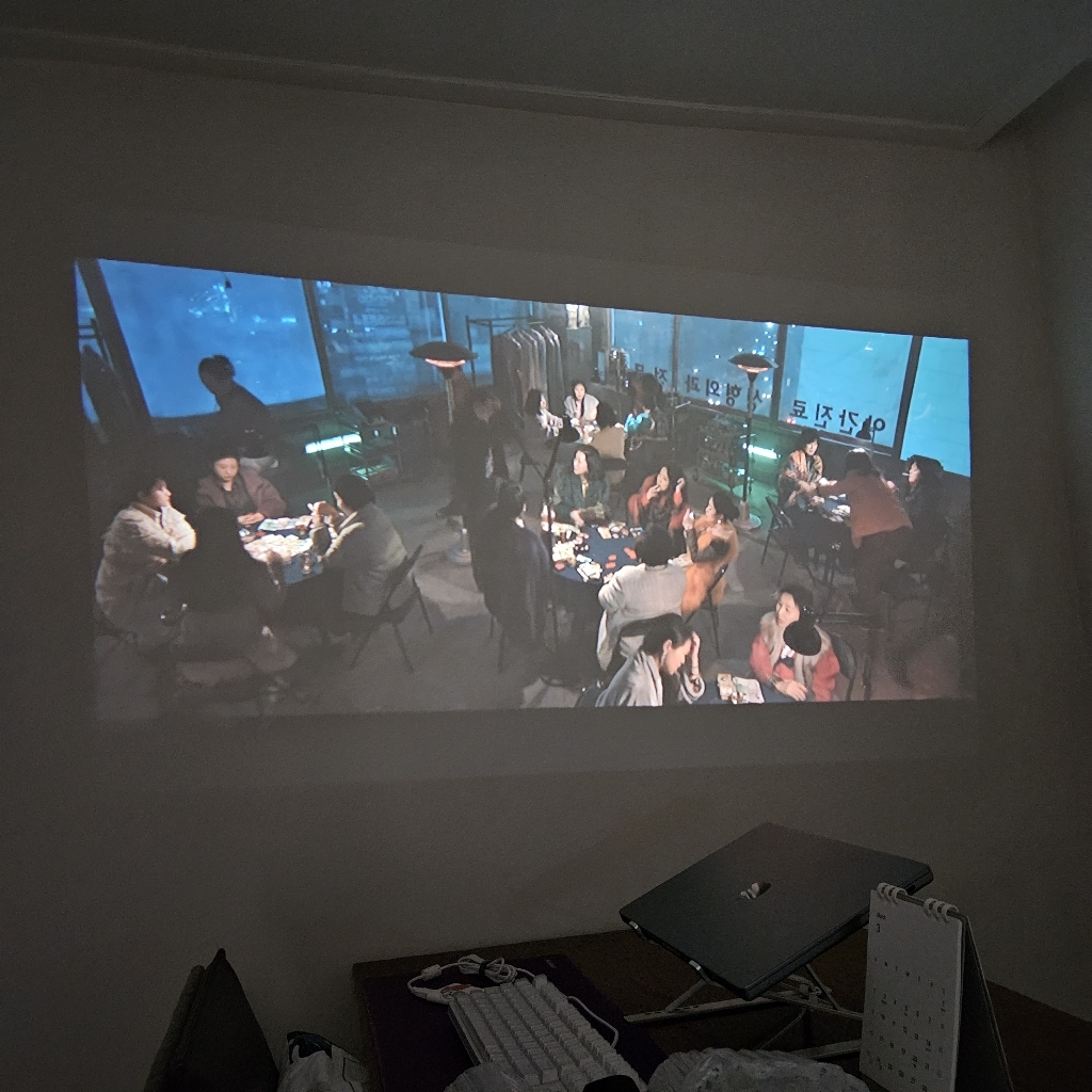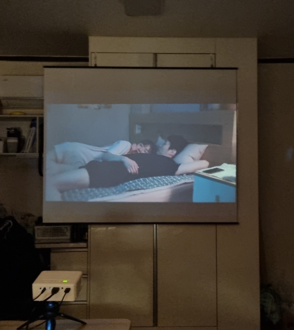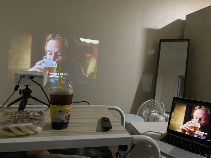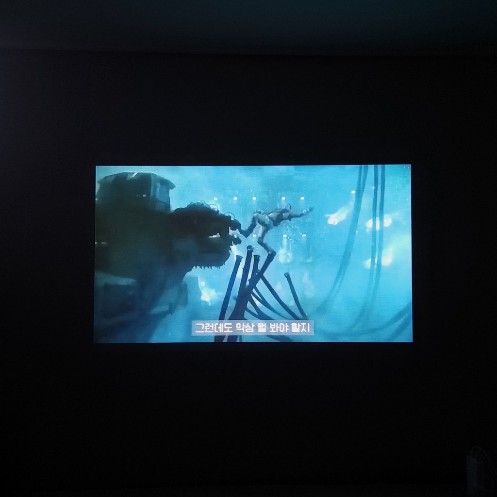 -퇴근 후 야식 놓고 빔프로젝터 틀어두고 영화보는 게 하루 끝의 낙으로 삼고 있습니다. 원룸인데 한쪽 벽에 꽉 맞아요.