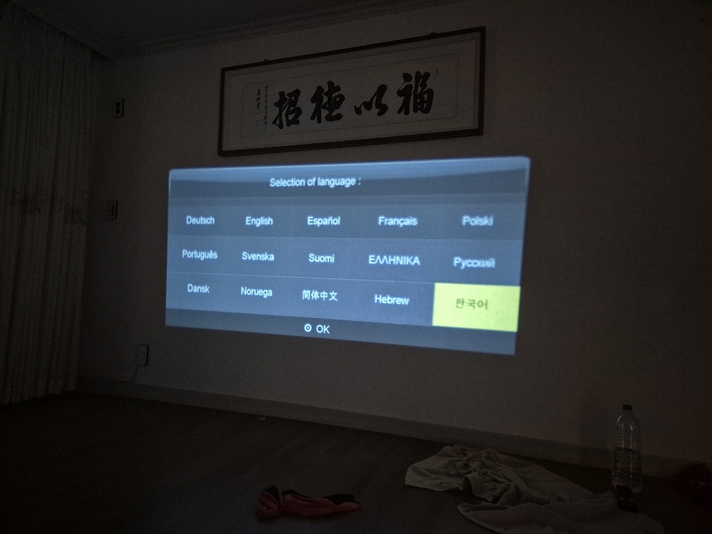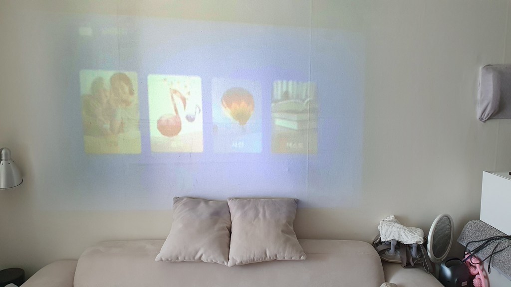 화면은 제일 크게 사용하고 있긴 한데 작게 줄이는 설정도 가능했습니다. 나름 소리도 잘나오고 벽에 쏘는데도 쓸만은 해서 계속 사용중입니다. 하지만 천장에 쏴서 쓰고 싶으신 분들이라면 다른 제품을 구매하는 것이 좋겠습니다.